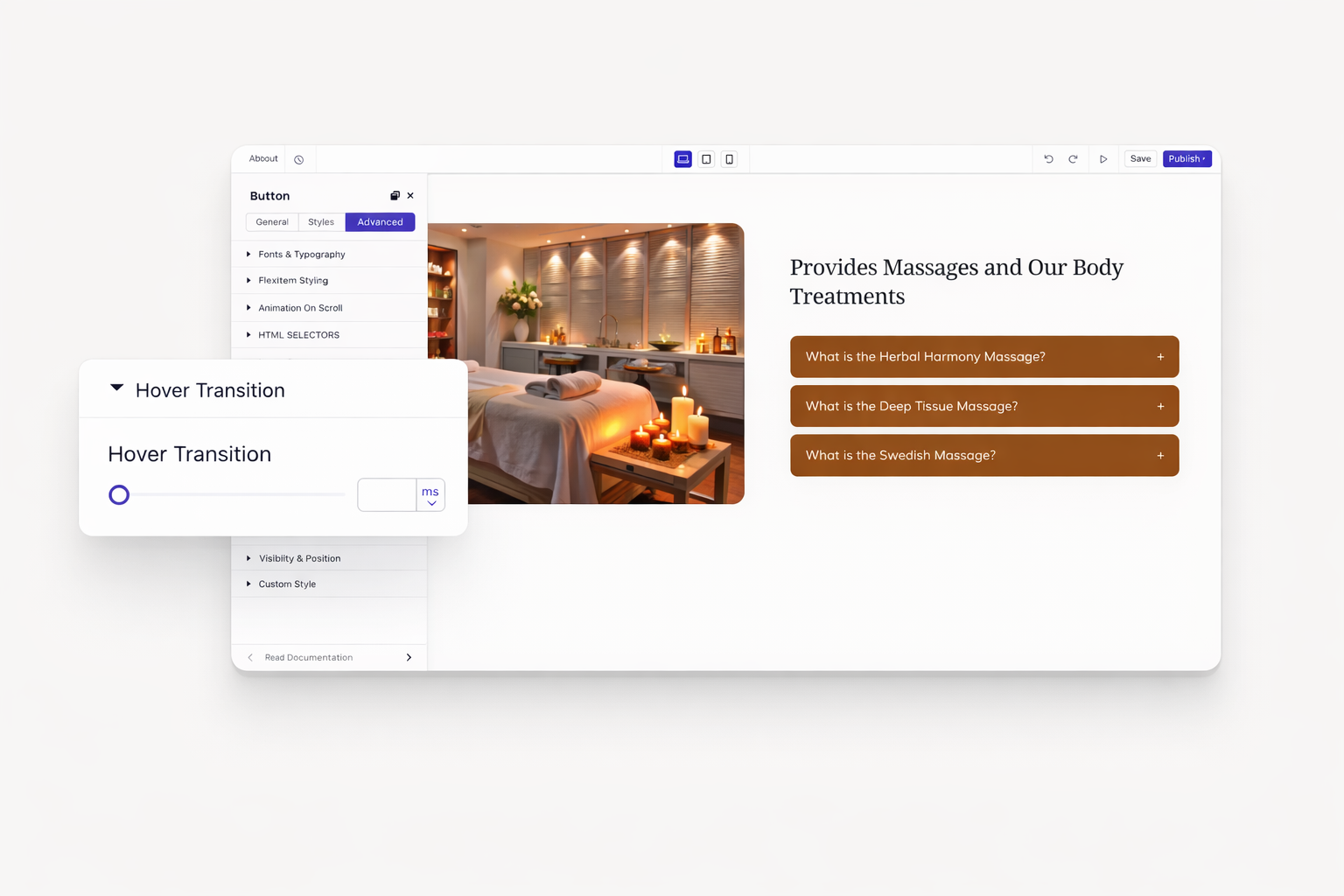 Abrupt changes feel jarring. Smooth transitions feel professional. Control how quickly elements respond to mouse movements. Set transition duration for natural, polished interactions. Your site feels responsive without being distracting.