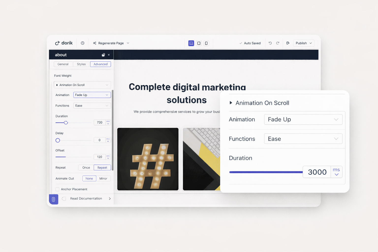 Dorik uses CSS-based animations optimized for performance. They run smoothly without impacting page load times. Your site remains fast while delivering engaging visual effects.