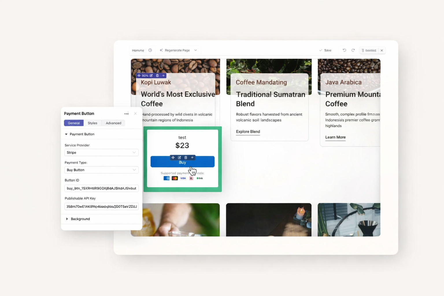 Process credit card payments instantly with Stripe integration. Set up one-time purchases or recurring subscriptions. Your customers complete checkout without leaving your site. No developer needed.