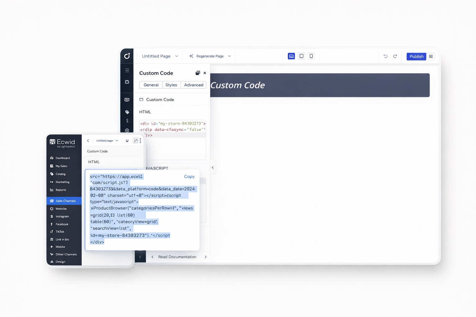 Add a complete shopping experience to your Dorik website. Ecwid provides product catalogs, shopping carts, and secure checkout. Installation takes minutes with simple code embedding.