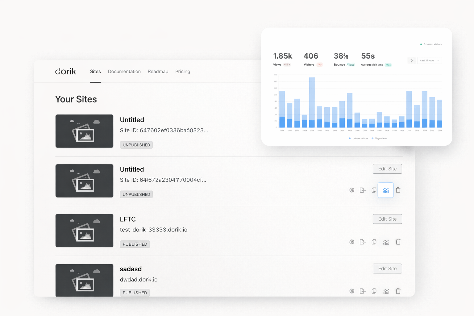 Privacy-first visitor tracking included free. Dorik User Analytics requires no cookie consent banners. Track pageviews, unique visitors, and bounce rates. See geographic and device data. Up to 2,000 pageviews included on free plan.