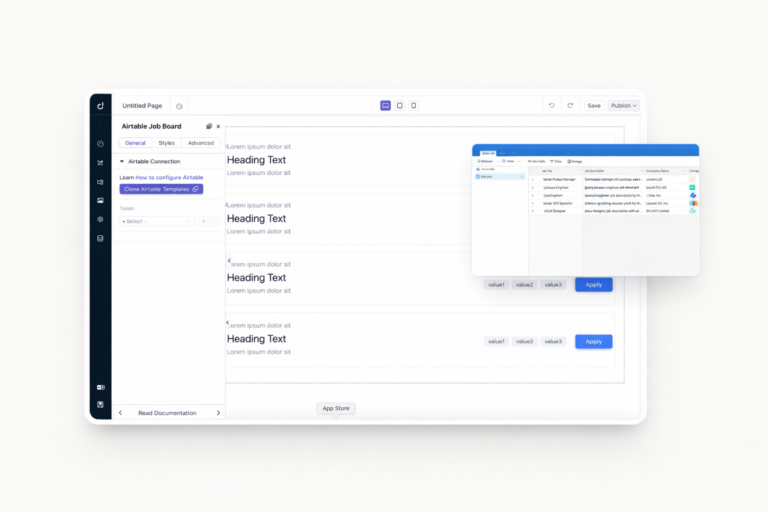 Create dynamic job listings from Airtable bases. Pre-filter options show relevant positions only. Search and filter functionality helps visitors find matches. Details pages display full job descriptions.