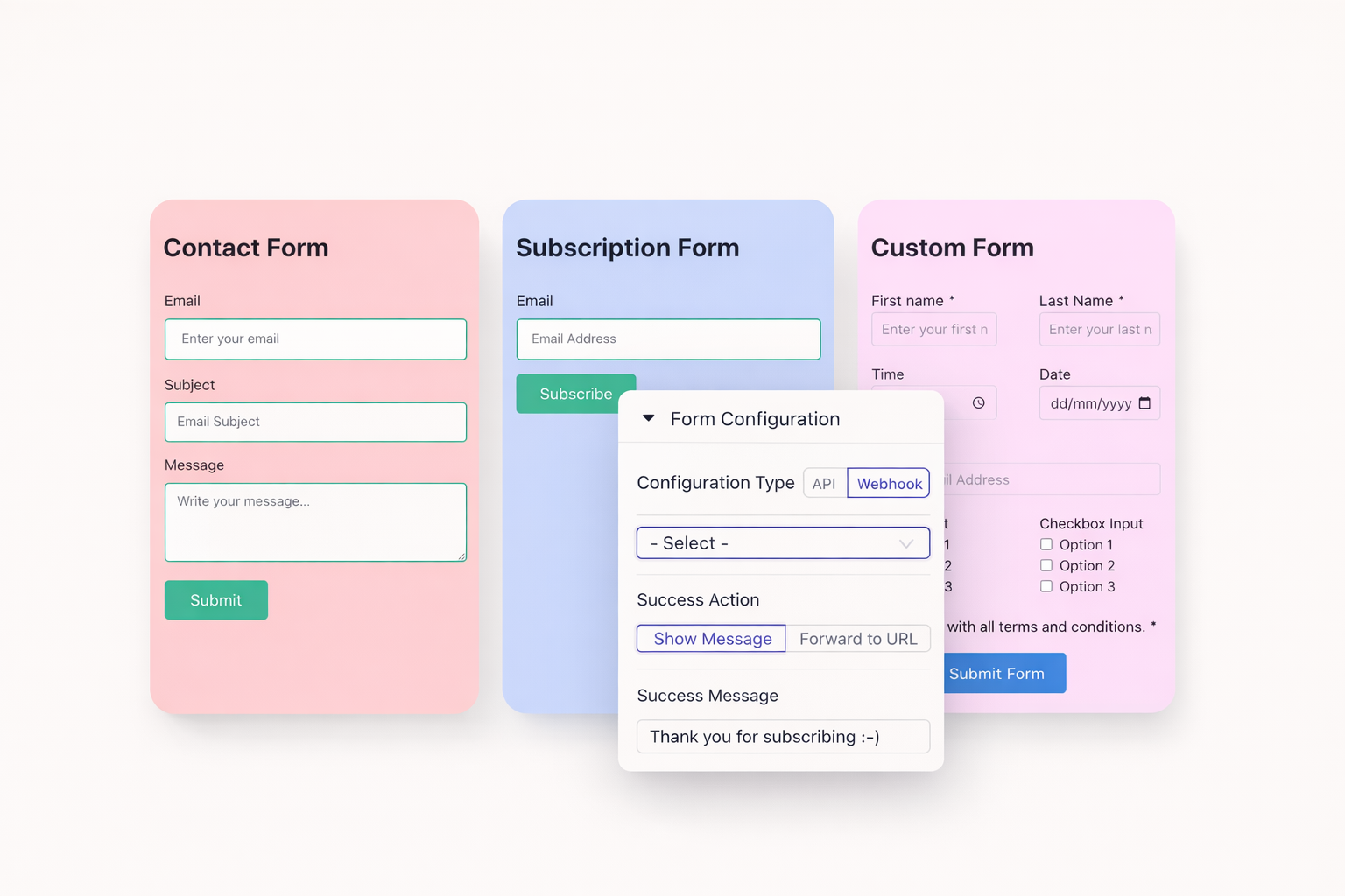 Each form connects to one email platform directly. Use Zapier or Make to send data to multiple services simultaneously. Native webhooks offer unlimited flexibility for complex setups.