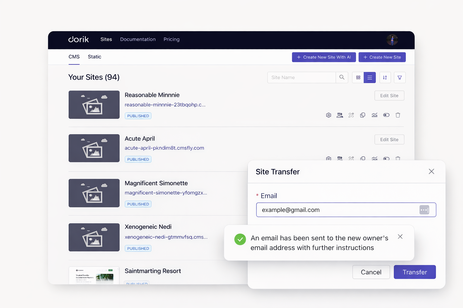 Use the site ownership transfer feature in your dashboard. Select the site. Enter the client's account details. Ownership transfers instantly.