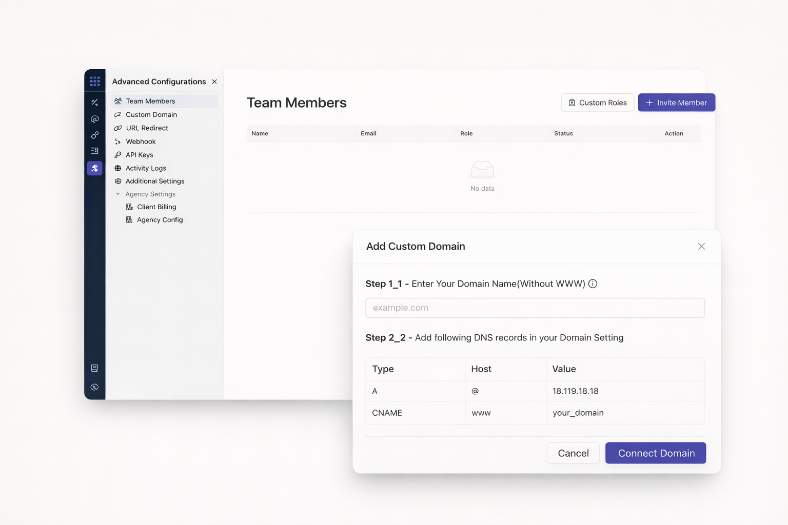 Agency plan includes unlimited custom domains and sites. Manage as many client projects as your business requires. No artificial limits on growth.