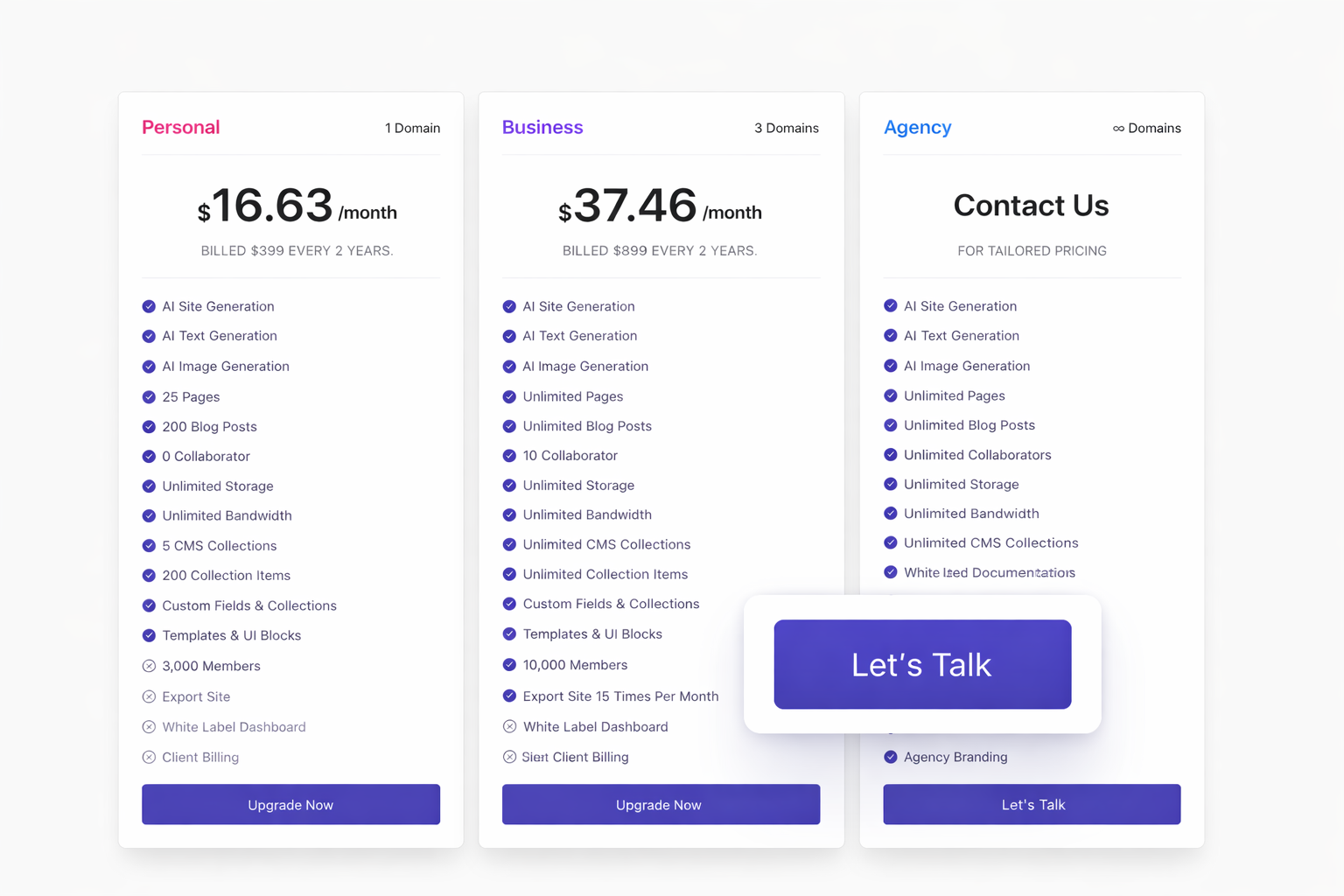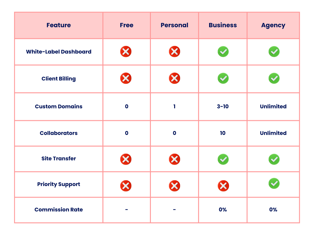 White-label capabilities activate on Business and Agency plans. Business includes core branding features. Agency adds unlimited domains, collaborators, client billing, white label documentation, and priority support.