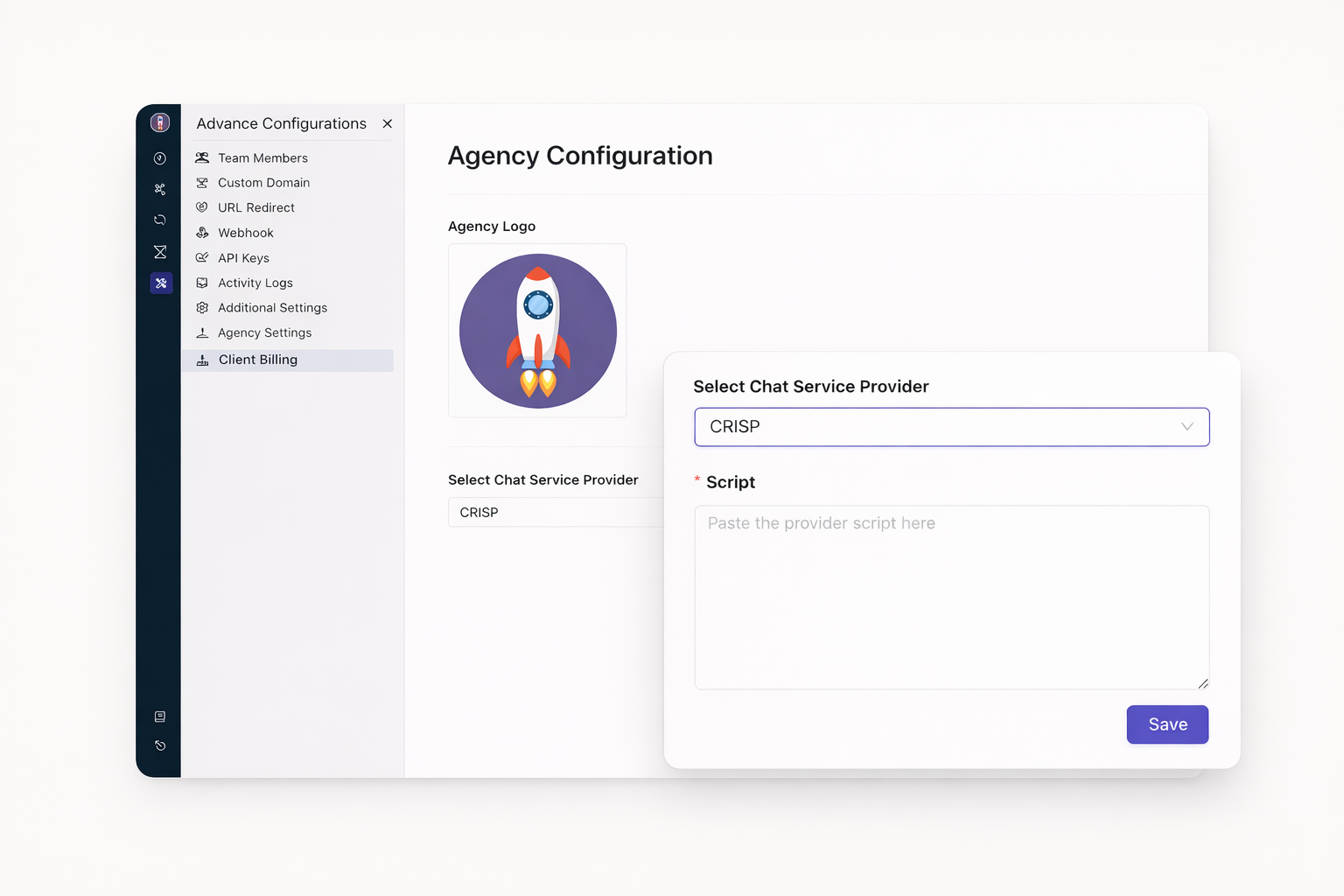 Connect Crisp, HubSpot, or other support widgets. Clients get help through your branded channels. Support conversations stay within your ecosystem.