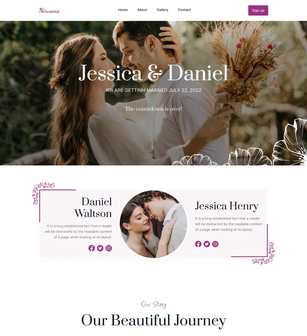 With Nirvana's pre-designed sections and drag-and-drop editor, you can launch a complete wedding website in just a few hours. Start with the existing layout, swap in your photos and text, customize colors to match your wedding palette, and publish. No coding knowledge required.